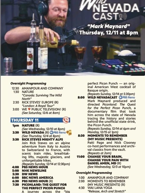 December 2, 2025 - PBS Reno will be celebrating Nevada’s official state drink by airing Piconland twice in December 2025. Tune in on Thursday, December 11th at 7:30 pm and again on Sunday, December 14th at 5:30 pm. Interested in the story behind the film? Stay tuned after the movie for the Wild Nevada Cast episode featuring Piconland director Mark Maynard as he talks with Wild Nevada Cast host Dave Santina about the making of the film.